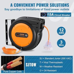VEVOR Retractable Extension Cord Reel, 65 FT, Heavy Duty 12AWG/3C SJTOW Power Cord,