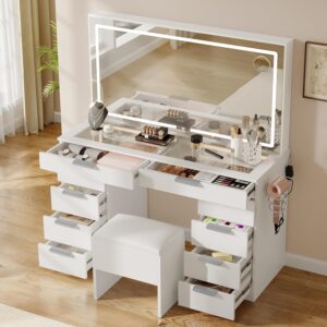 Makeup Vanity with Light Strip & Extra-Large Mirror, 10-Drawer Vanity Table Set with Power Hub