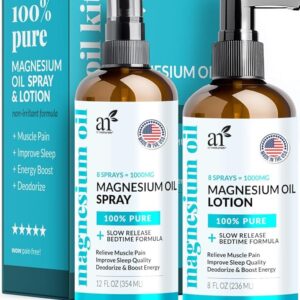 Magnesium Oil Spray 12 oz + Body Massage Lotion Set 8oz for Feet, Pain & Sleep