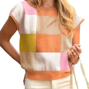 Womens Short Sleeve Sweater Top Summer Color Block Lightweight Knit Crewneck