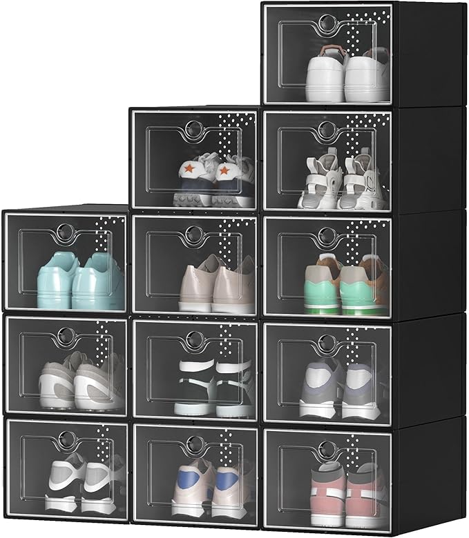 • Space Saving Shoe Storage Boxes: A set of 12 pack shoe boxes take up less space than a bunch of shoes laying around. Keep your shoes greatly organized and neat. Suitable for different types of shoes, such as sneakers, flats, heels, sandals, flip flops, wedges.