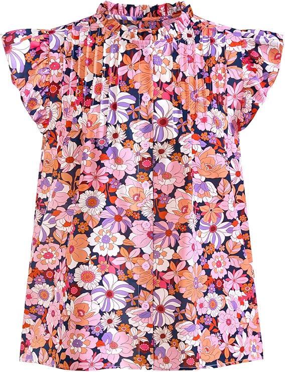 PRETTYGARDEN Women Button Down Boho Shirts Floral Ruffle Cap Sleeve Mock Neck Flowy Casual Summer Blouses Tops