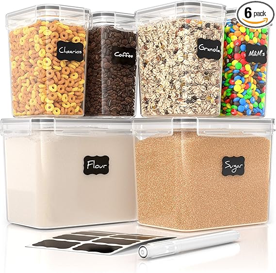 Simple Gourmet Airtight Food Storage Containers – Set of 6 Flour and Sugar Canisters for Pantry Storage and Organization – Marker & Labels Included