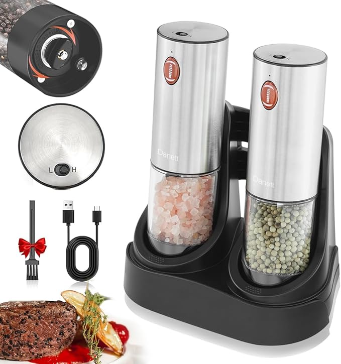 New 2Pack Rechargeable Electric Salt and Pepper Grinder Set with Charging Base Portable,Automatic Mills LED Light,7-Level Coarseness & 2-Speed Adjustable,One-Handed Operation-Exclusive Football Button