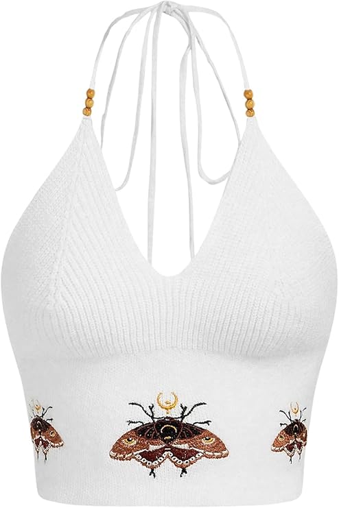 Verdusa Women’s Crop Halter Tops Y2k Goth Clothes Crochet Cami Sleeveless Tie Backless Boho Knit Top Camisole