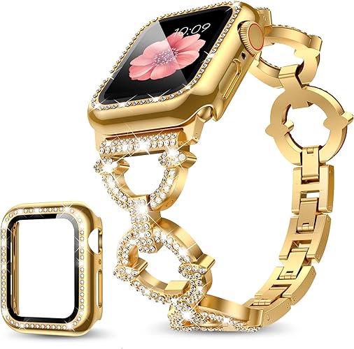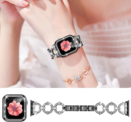 Mesime Compatible with Apple Watch Band 38mm 40mm 41mm 42mm 44mm 45mm 46mm, Women Bling Jewelry Bands with Tempered Glass Screen Protector Case, Shiny Strap for iWatch Series 10/9/8/7/6/5/4/3/2/1/SE